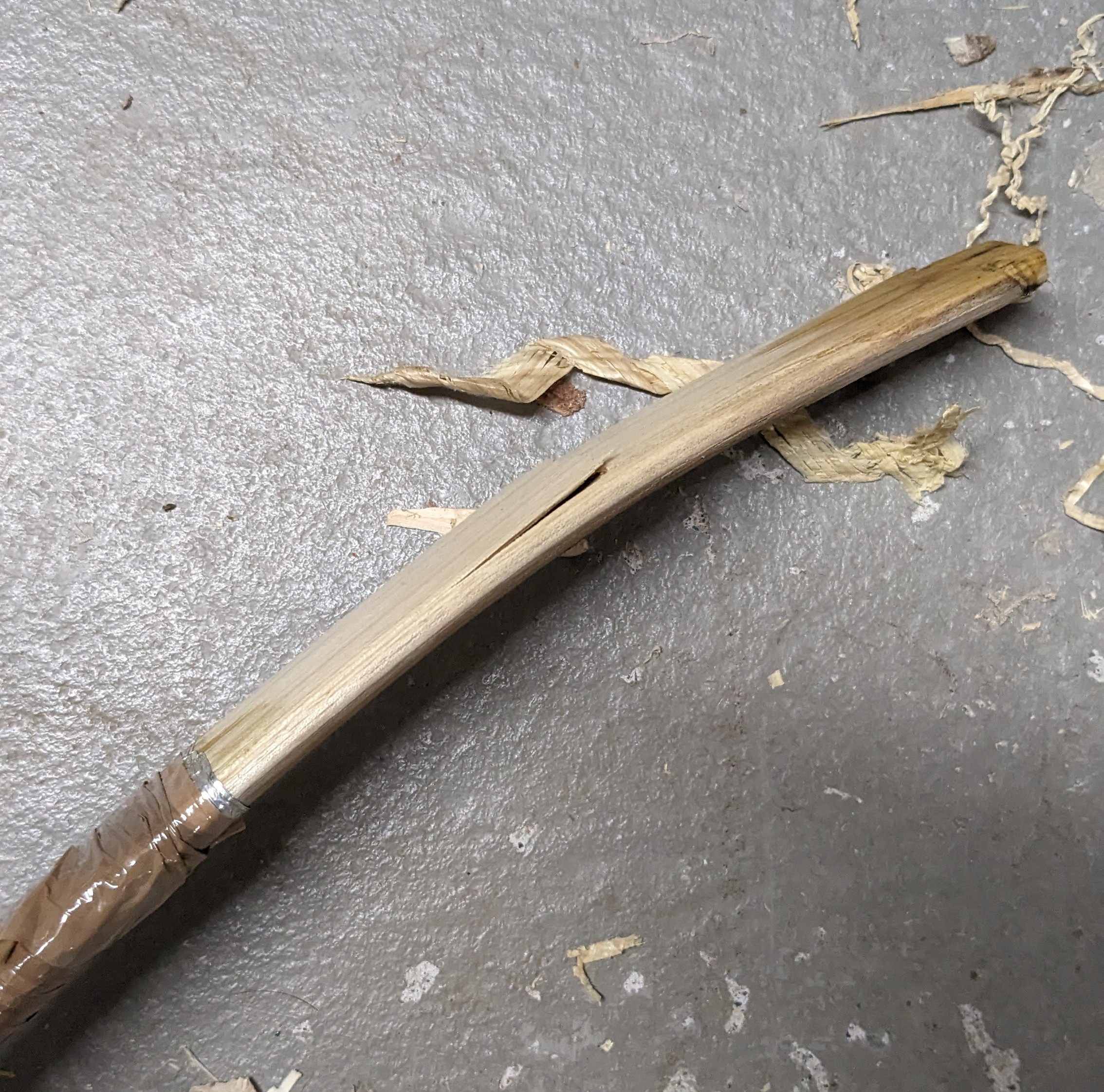 Ich wollte in den mittleren Bogen Recurves mit Dampf einbiegen. Erster Versuch hat dazu geführt, dass der Bogen jetzt anstatt 116cm nur noch ein Meter lang ist.