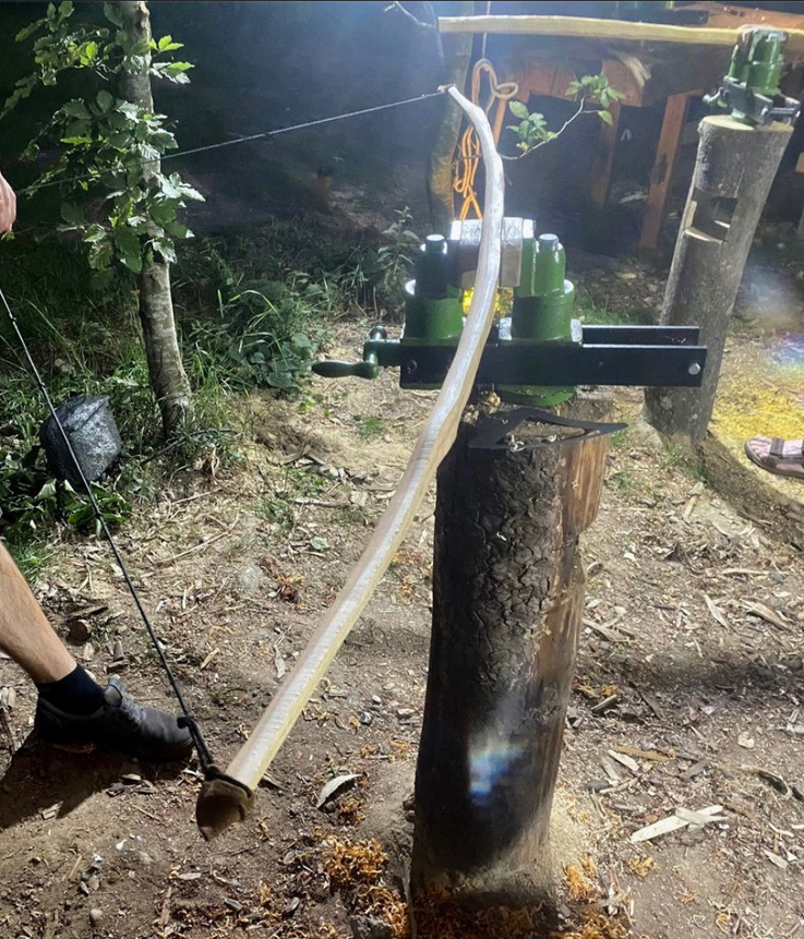 Wenn man etwas Platz im Garten hat, dann kann man auch ein Stück Stamm fest eingraben und den Schraubstock darauf montieren: Im Hintergrund sieht man einen Stamm mit Ausschnitt zur Montage des Schraubstocks.