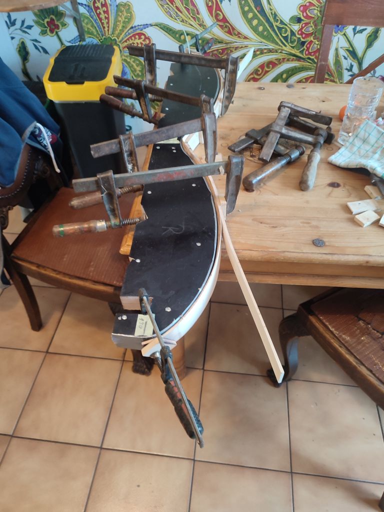 Heute habe ich die Hasellaminate erst gedämpft und dann in die Formgezogen. Der Rest ging mit dem Heißluftfön. Zuerst den Rücken in die Form Zwingen, dann mit Kabelbinder fixieren, damit ich die Zwingen wieder entfernen. Jetzt ist alles bereit das zweite Laminat auf zu nehmen. So darf alles mal trocknen...