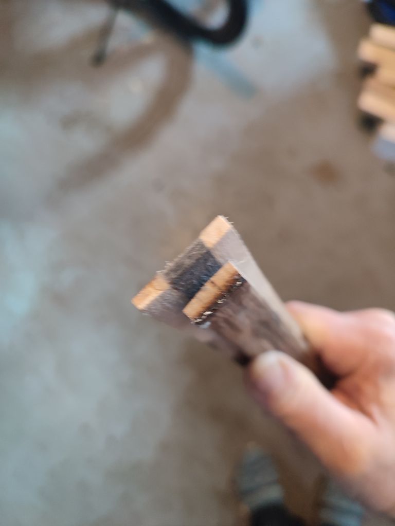 Naja 4,5 Wochen sind jetzt nicht gerad üppig, aber ich denke das sollte gehen. Der Hasel sieht gut trocken aus und verliert zur Zeit kein Gewicht. Die Laminate sind erneut an dem Bandschleier abgezogen und alles sieht gut, alles schön gerade. Das Horn wurde auch schon vorbereitet, also es wurde grob zugeschnitten und am Bandschleifer grob auf Dicke gebracht. Danach habe ich das Horn erhitz und gerade gebogen, nun auf ein Brett mit doppelseitigem Klebeband fixiert und mit dem Bandschleifer auf der Klebeseite plangeschliffen. Jetzt konnte ich das Horn umdrehen, mit Klebeband fixieren und auf Fertigmaß 4mm Schleifen. Danach wurde es in 1,5cm gerade Streifen geschnitten. Morgen wird dann das Baulaminat geröstet und in der Mitte aufgeschnitten, damit das Horn eingeklebt werden kann.