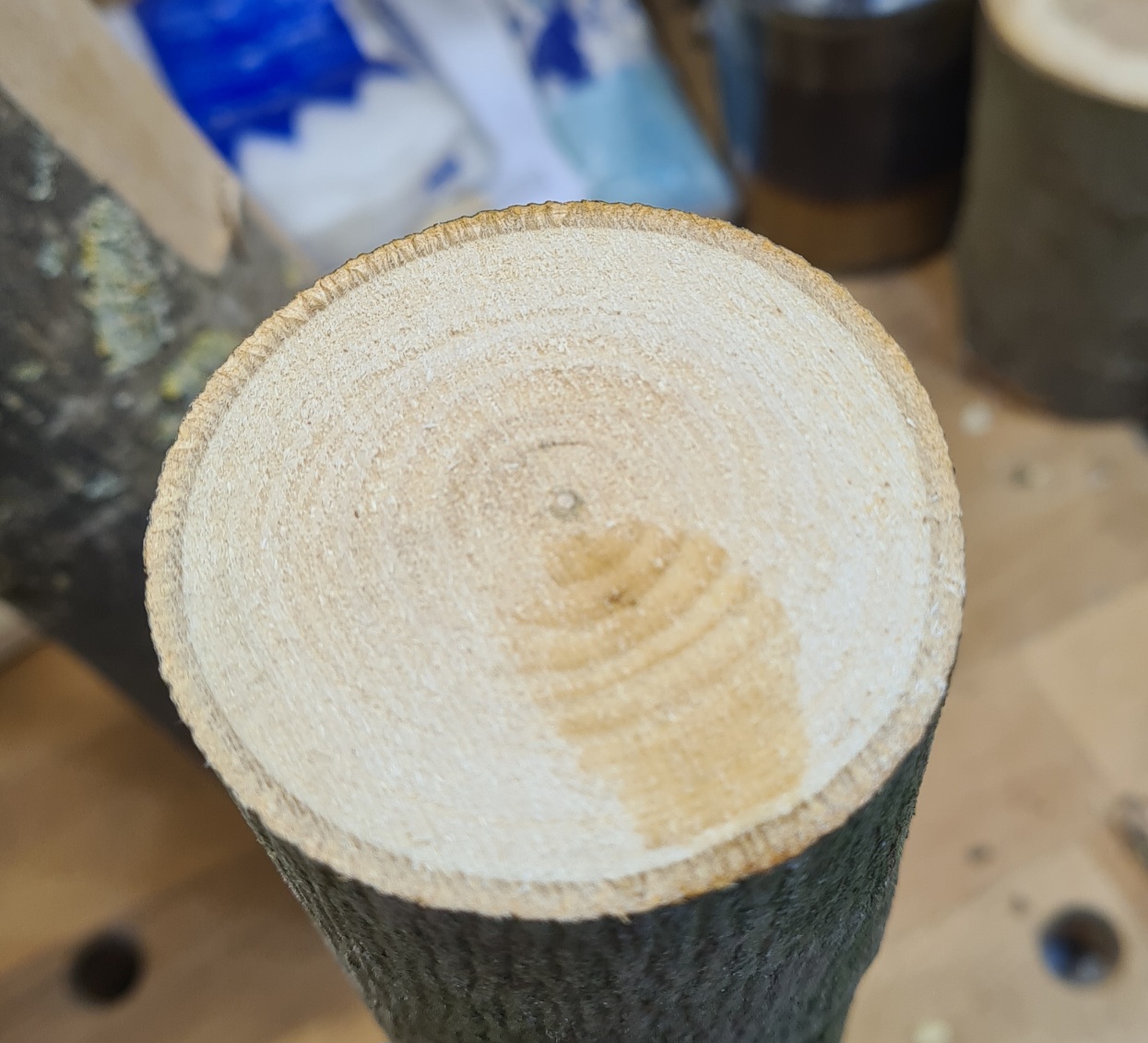 Der Splint ist ziemlich vergammelt, geht teilweise in den ersten Spätholzring. Ich versuche jetzt bis zum 2 Spätholzring vorzuarbeiten.