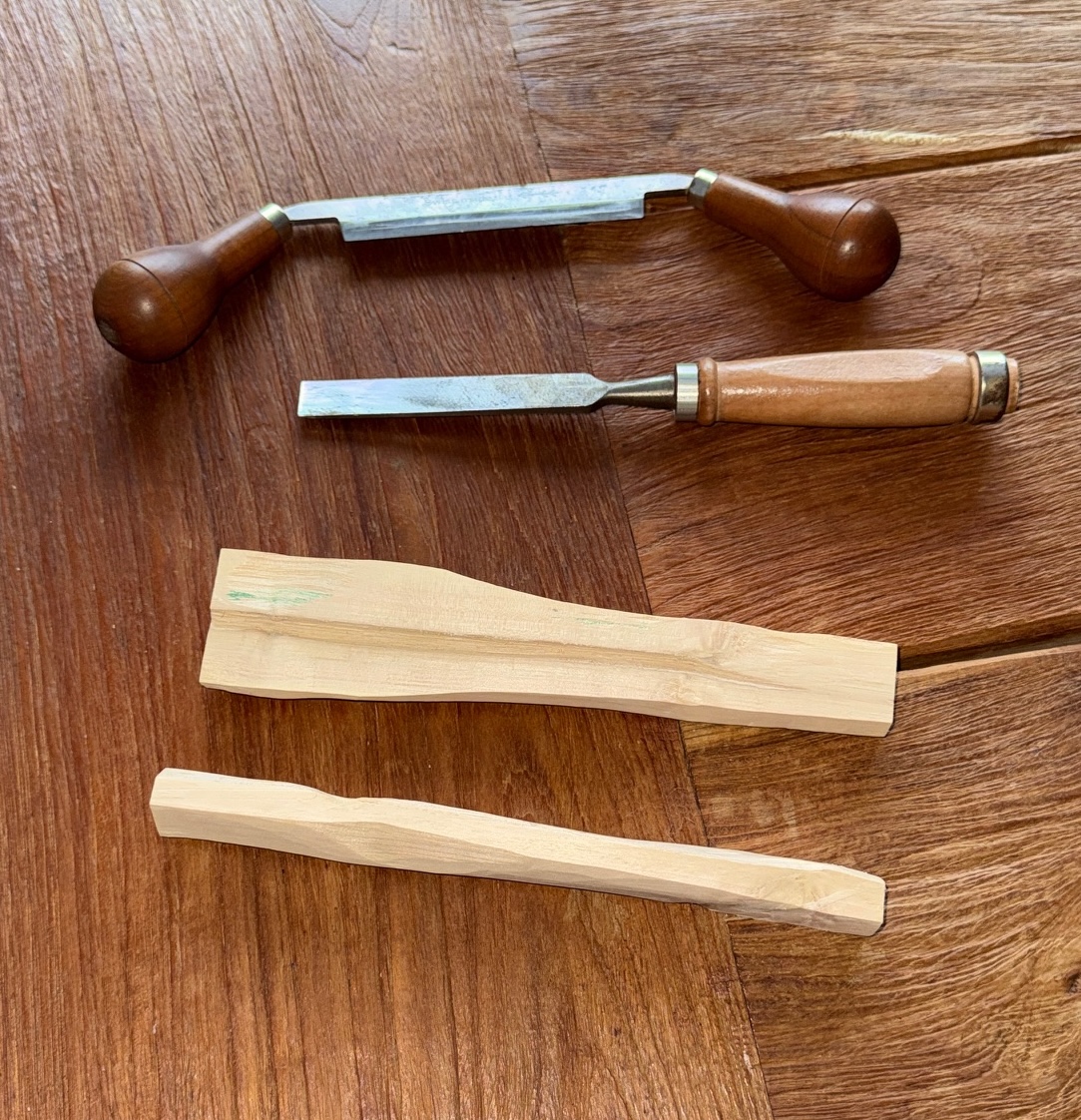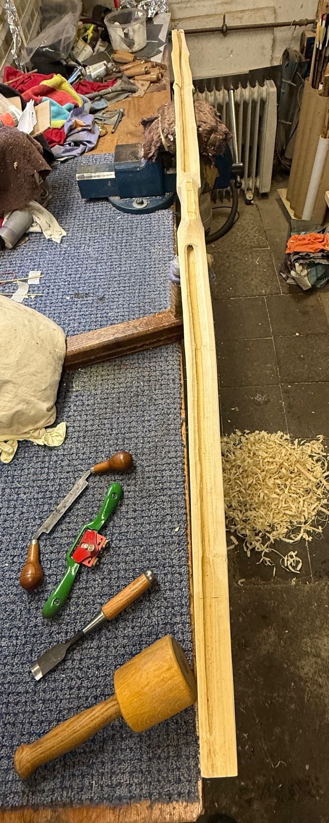 Ich habe die Dicke der WA auf 25mm runtergearbeitet, den uWA schmaler als den oberen gemacht, das HLD weiter bis auf den Markkanal runtergearbeitet und noch ein wenig am Griff geraspelt. Ich habe den Kanal im Griff mit Tempo ausgestopft damit der möglichst nicht reisst. Noch hats keine Risse, aber er verdreht sich ganz leicht im Uhrzeigersinn. Gewicht: 1250g.