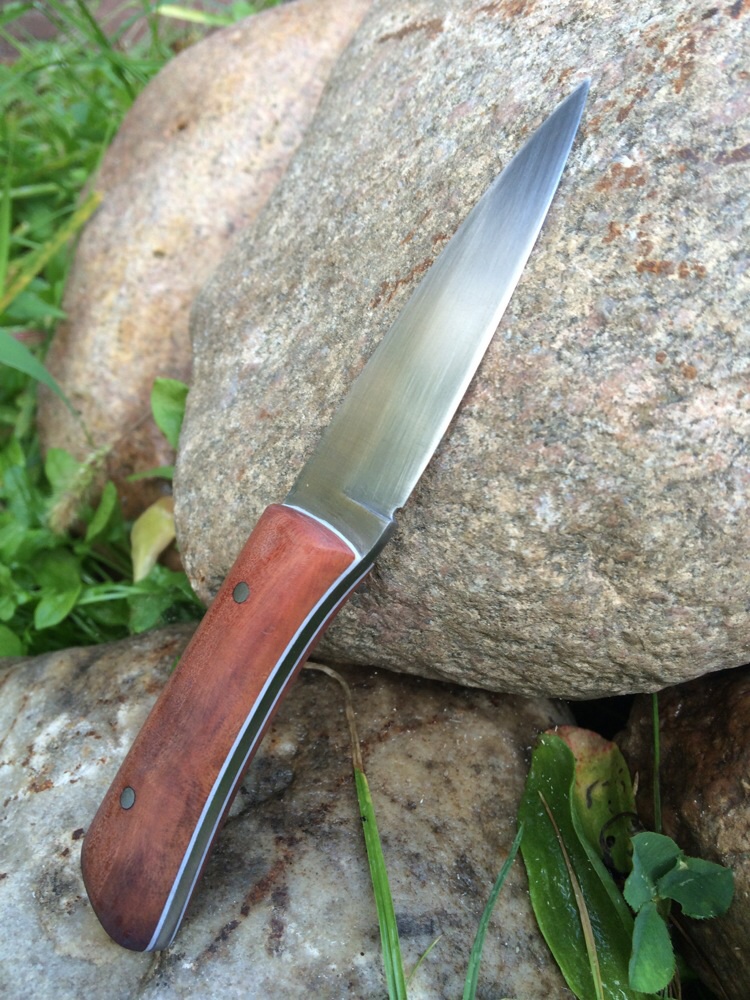 ich schiebe gleich noch ein Messer nach, ein kleines Heiku. Das Ist schon das dritte Messer (#31 und 32) in diesem Stil und dieser Größe. Das erste (#31) davon kommt jeden Tag in meiner Küche zum Einsatz, mein Lieblingsmesser und andere scheinen diese Form auch zu mögen. Ich hab noch so eines auf meiner Werkbank liegen, mal sehen ob ich es dieses Jahr noch fertig bekomme.