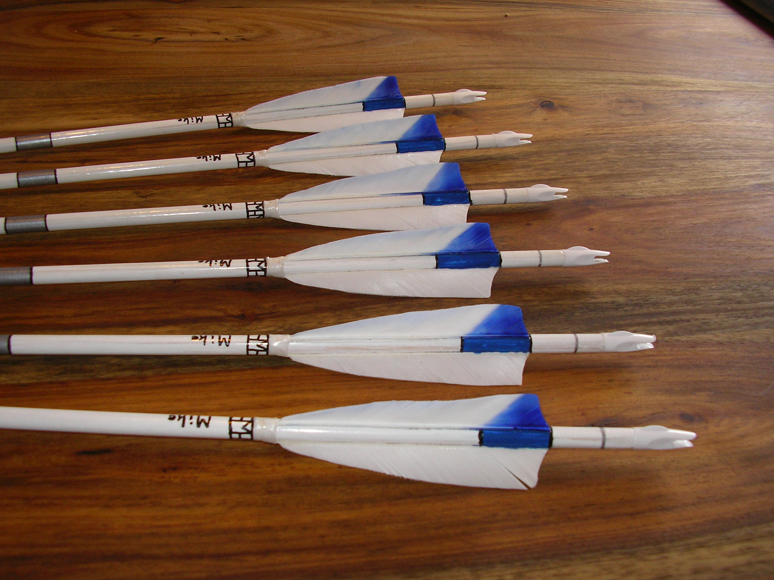 Den hinteren Teil des Schaftes habe ich weiß lackiert, darüber kam nach einem Zwischenschliff Klarlack, nach einem weiteren Zwischenschliff habe ich Nocken und Federn aufgeklebt, natürlich gut entfettet mit Nitro-Verdünnung. Den Blauen Bereich zwischen den Federn habe ich mit Malerkrepp abgeklebt und mit blauem Lack lackiert. Nach dem Trocknen habe ich den silbernen Ring mit Lackstift unter den Nocken aufgemalt, das Kreppband abgemacht, den Lack angeschliffen und mit schwarzem Lackstift die Umrandung des blauen Teils gemalt. Dafür habe ich eine Schuhschachtel mit zwei Einkerbungen. Darin kann ich den Pfeil gut ablegen und drehen.