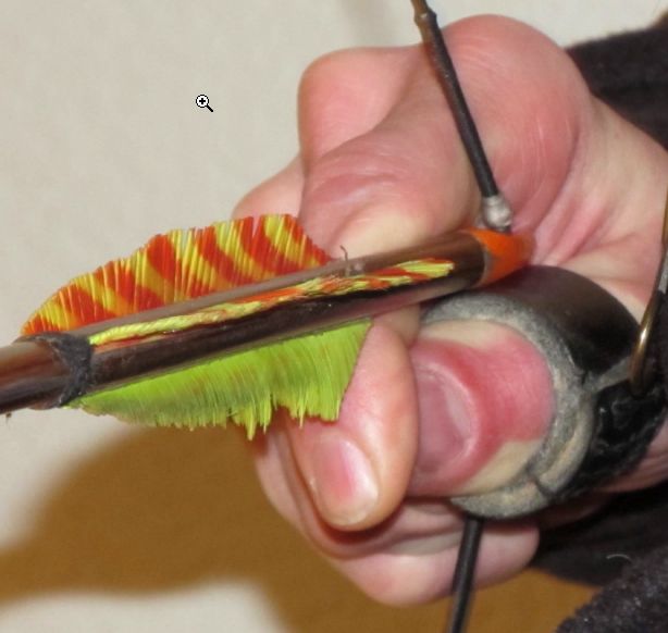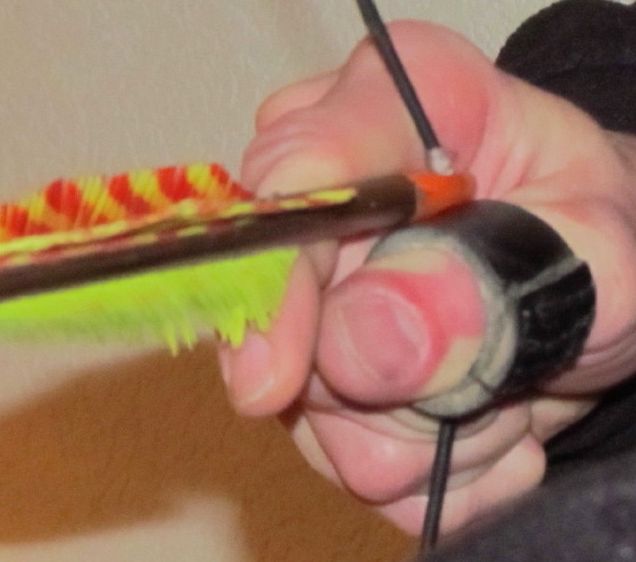 Das von Ralph geschriebene kann ich unterstützen. Der starre Holzdaumen hat einfach den Vorteil, dass man den Daumen ganz entspannt in seinen Kokon legen kann und dann durch ein Drehen der rechten Hand nach innen die Sehne nur noch ganz knapp in der Sehnengrube liegt. Das Lösen der Sehne aus der Grube wird dann halt durch einen starken Druck-Dreh-Impuls der linken ! Hand ausgelöst. Ein Klammern der Sehne (Daumen nach innen abknicken) ist bei dieser Technik absolut kontraproduktiv (und zerstört auf Dauer den Handschuh).