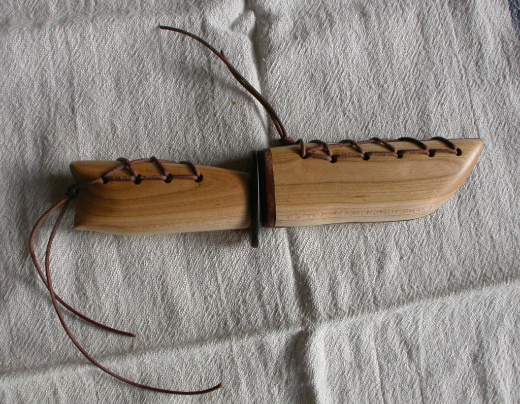 Die Methode, die Scheide längs aufzuschneiden, ein Stück Leder in der Stärke des Klingenrückens dazwischenzukleben, aus dem die Klingenform dann wieder ausgeschnitten wird, erweist sich als sehr probat für mich.