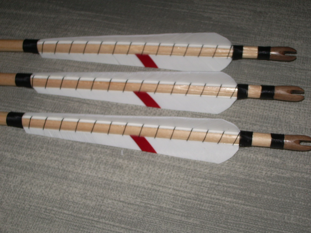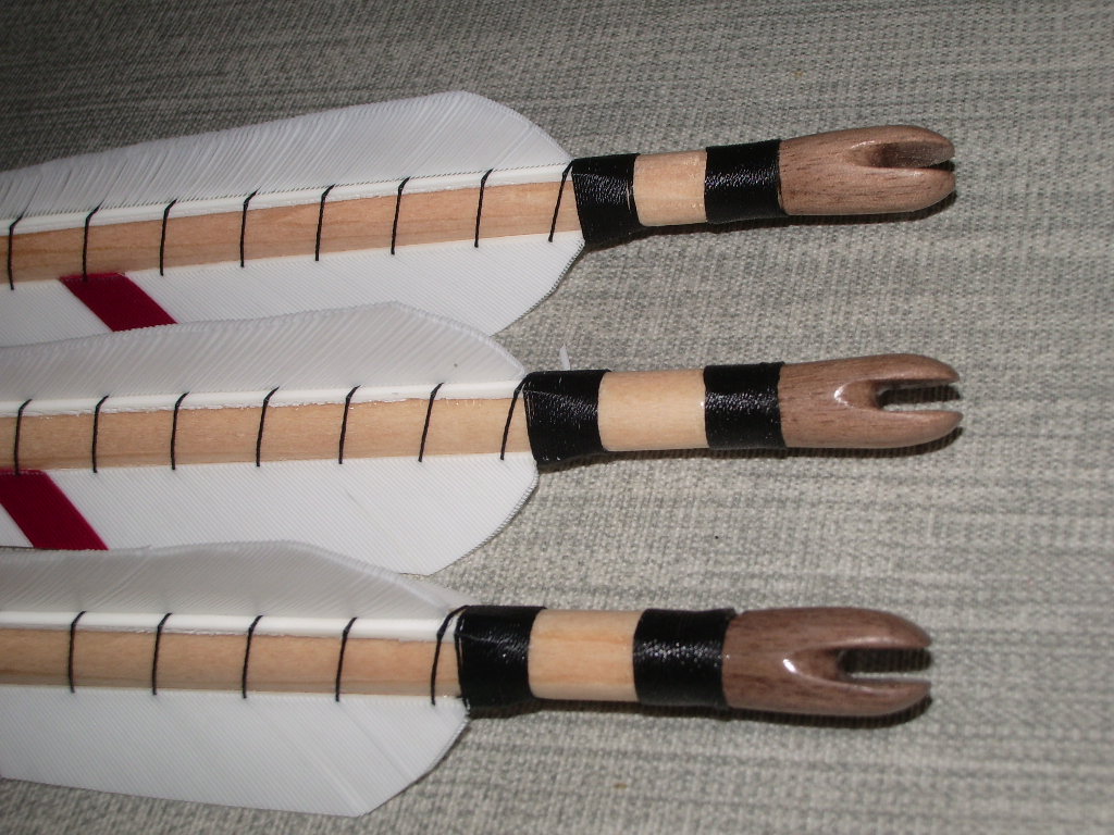 Mir gefällt diese Variante am besten, weil sie den Eindruck vermitteln, dass der verjüngte Schaft und die verdickte Nocke aus einem Stück Holz gearbeitet wurden, was an historischen Pfeilen wohl die Königsklasse darstellt...