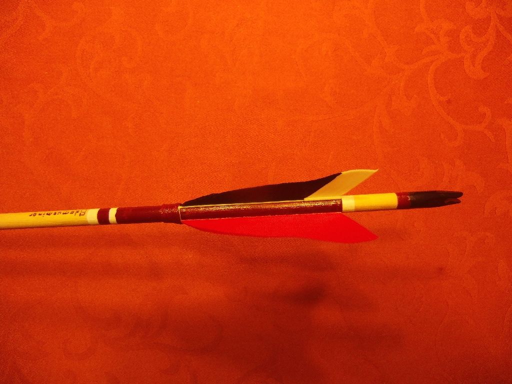 Und hier das Endergebnis. Lasiert und lackiert gemäß der Empfehlungen vom Raben, das ganze überzogen mit Setta Aqua Siegel, einem Acryl-PU-Lack von dem ich mittlerweile wirklich überzeugt bin. Die 14 Pfeile haben 31 Zoll, sind aus Fichte und wiegen allesamt zwischen 382 und 383gn. Der Spine variiert etwas stärker, ich denke, im Bereich 43-47lbs (hab keine Möglichkeit, es nachzumessen). Aber bei Daumentechnik ist der ja weniger relevant. Die Spitzen kommen auf 80gn (40 der Adapter und 40 die Spitze selbst). Dreifach 4" parabol-befiedert. Diese Federform kommt beim Daumenring-Riegel dem auf dem Daumen liegenden Zeigefinger nicht in die Quere. Und weil ich beim (mehrfachen) Richten der Schäfte gemerkt habe, wie weit diese Dinger von einem wirklich geraden Karbonschaft entfernt sein können, bin ich zu einer leichten Windung der Federn zurück, damit der Pfeil im Flug schön rotiert.