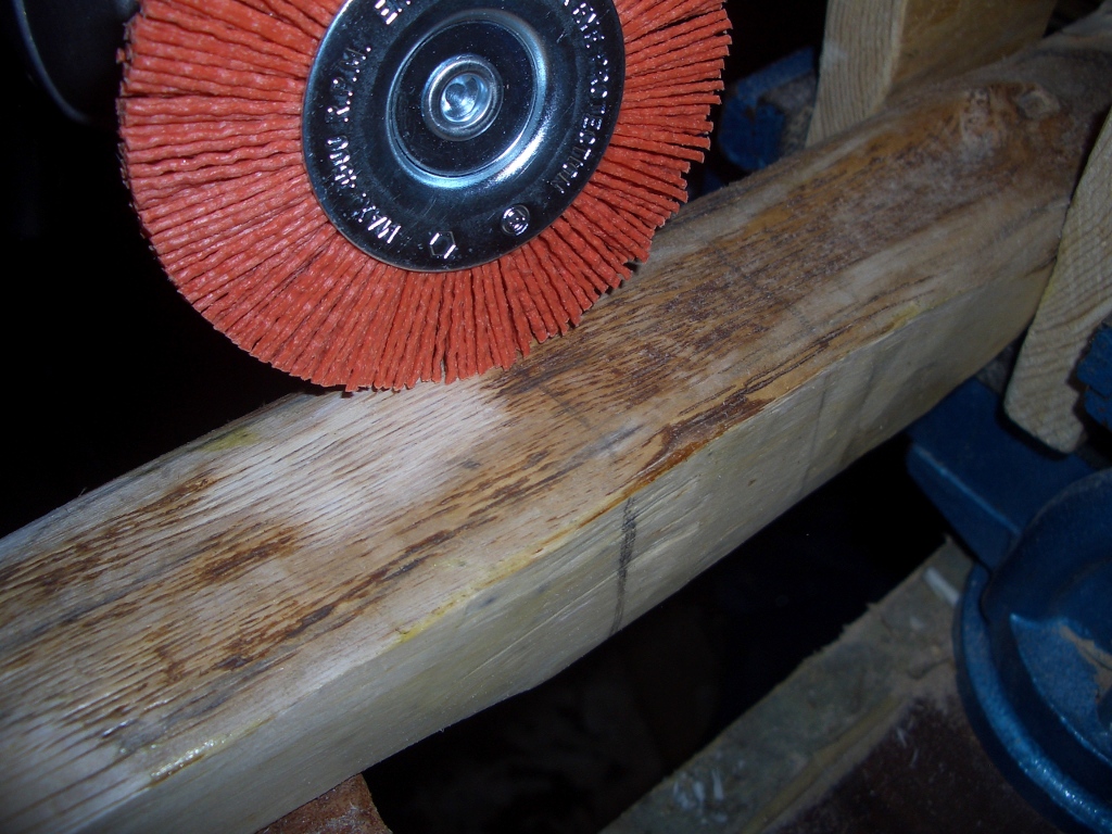 Ersatzweise habe ich dann mit ner (inzwischen eingetroffenen) roten Kunststoffbürste von Wolfcraft versucht, den Rücken da zu putzen, wo er stehenbleiben soll. Mit diesem Modell gehen die Bastreste auch recht gut runter, man muss aber aufpassen, dass man nur mit geringen Drehzahlen arbeitet und nicht zu sehr aufdrückt.