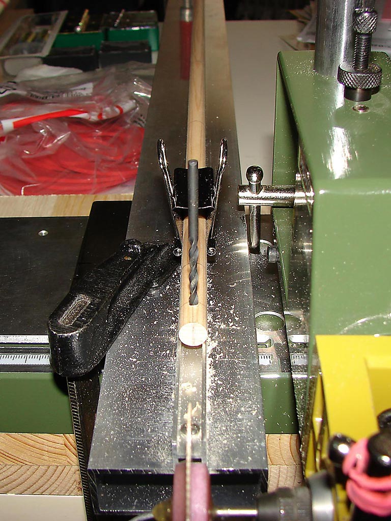 Als sehr hilfreich zur senkrechten Ausrichtung des Schafts erweist es sich, den 3mm-Bohrer kurz vor dem Fixieren mit der Foldback-Klammer in die Vorbohrung zu stecken, um die Vorbohrung genau auszuloten. Oftmal verläuft die Bohrung entgegen der aufgebrachten Zeichnung. Und der eingesteckte Bohrer zeigt das zuverlässig an. Steht der Schaft senkrecht wird er mit der Foldback-Klammer, die auf dem H-Profil aufliegt, eingeklemmt, bzw. festgeklemmt. Damit lässt sich der Schaft zur Säge führen ohne dass er kippelt. Dann muss unbedingt der Bohrer entfernt werden! Sonst kann man nicht Sägen.