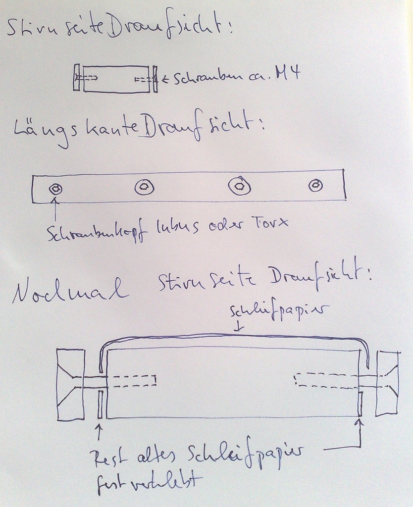 Hallo Heidjer, vielleicht könnte diese Befestigungs-Methode für das Schleifpapier funktionieren. Erstmal die Skizze: