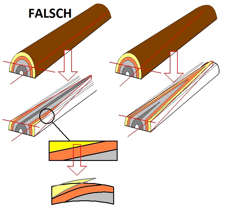 Nun zum Thema Decrowning. Der Sinn des Decrownens ist, dass die hohe Wölbung des Rückens abgenommen werden soll, also "decrowned" wird, damit sich die Zugspannung auf eine größere Anzahl an Holzfasern verteilt.