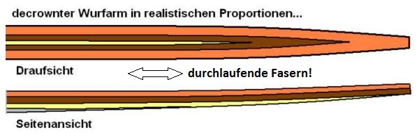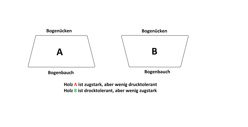 Etwas ganz wichtiges noch: WENN man Hasel decrowned und damit mehr Fasern die Zugarbeit auffangen lässt, dann muss der Bogenbauch mehr Arbeit leisten, bzw. wird stärker komprimiert. Denn dadurch, dass jetzt am Bogenrücken mehr Fasern die Zugkräfte auffangen wird der Bogenrücken auch weniger auseinandergezogen. Wenn nur wenige Fasern die Zugkräfte auffangen werden diese auch mehr beansprucht und dehnen sich entsprechend weiter. Dadurch muss dann der Bogenbauch weniger Kompression aushalten ;-)