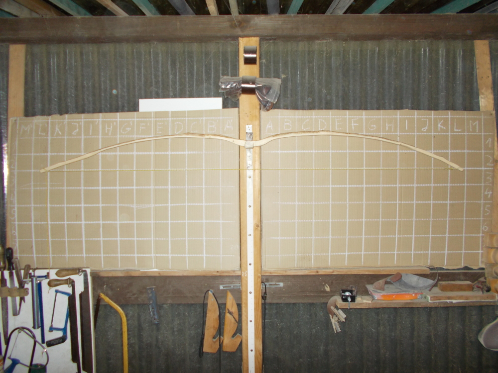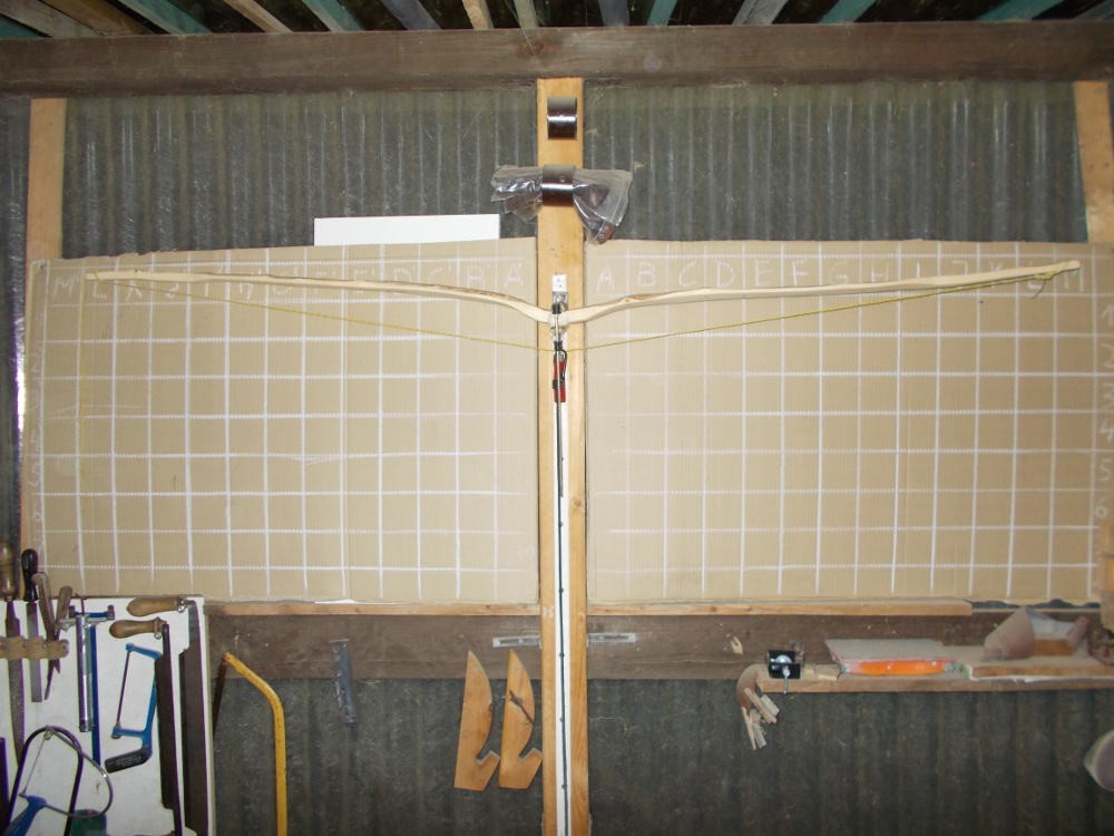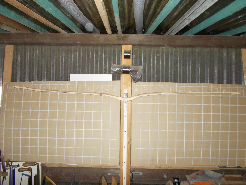 Tatsächlich hat der Stave 8g an einem Tag draußen wieder an Gewicht zugelegt. Das bedeutet für mich, daß die Trocknung abgeschlossen ist. Also heute die Mittenwicklung gemacht, ein wenig den Tiller an der Wand überprüft und ein paar Pfeile