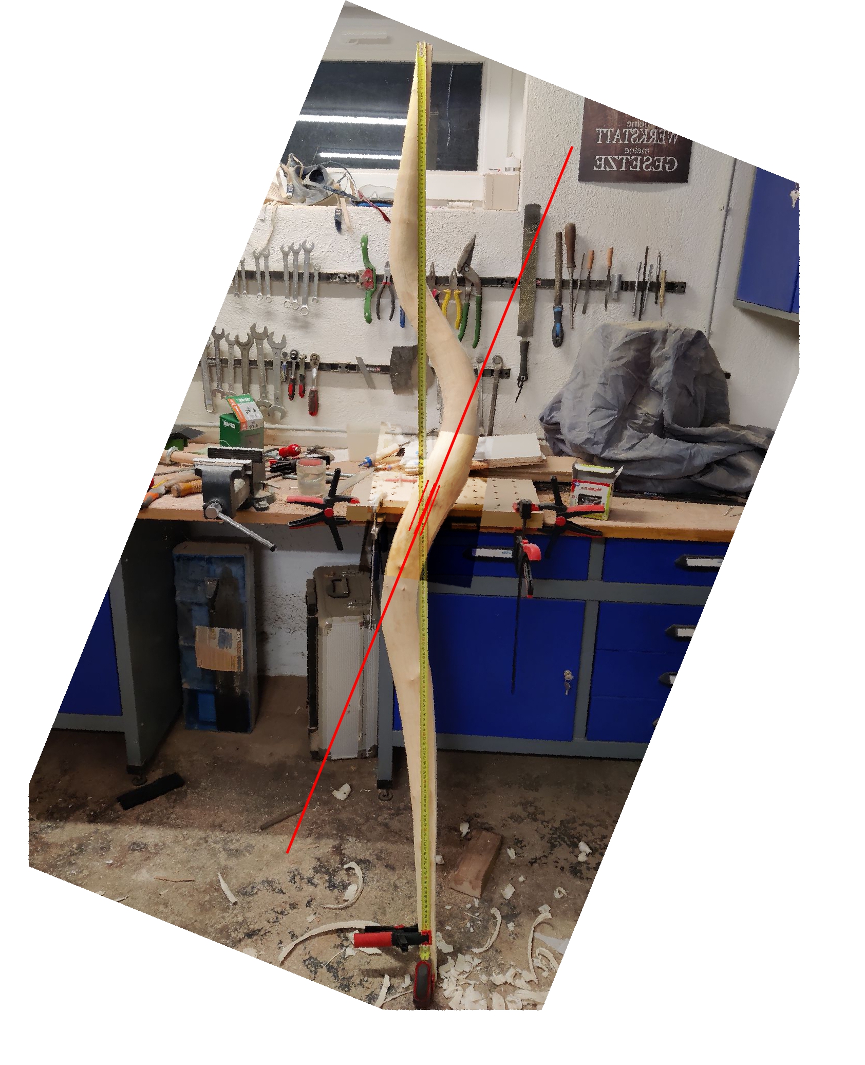 Was das angeht... Ich war gestern unmittelbar nach meinem Fotoupdate nochmal an der Bandsäge... Aber es muss trotzdem noch genug "Fleisch" da sein um alles offen zu haben. Denn ich habe den Wurfarm 5cm breit gezeichnet und die Enden 1,5cm und beim ausschneiden an beiden Seiten 1cm Abstand gelassen. Wie auf den Fotos zu sehen geht sich immer noch ein Z-Griff aus. Und die Sehnenlage kann ich über den Verlauf der Enden korrigieren. Der Z-Griff wirkt etwas komisch, da er für gewöhnlich anders herum umgesetzt wird. Jedenfalls halte ich es schon für eine gute Idee. Ich schätze es reduziert die Schräglage des Bogens um ca die Hälfte.