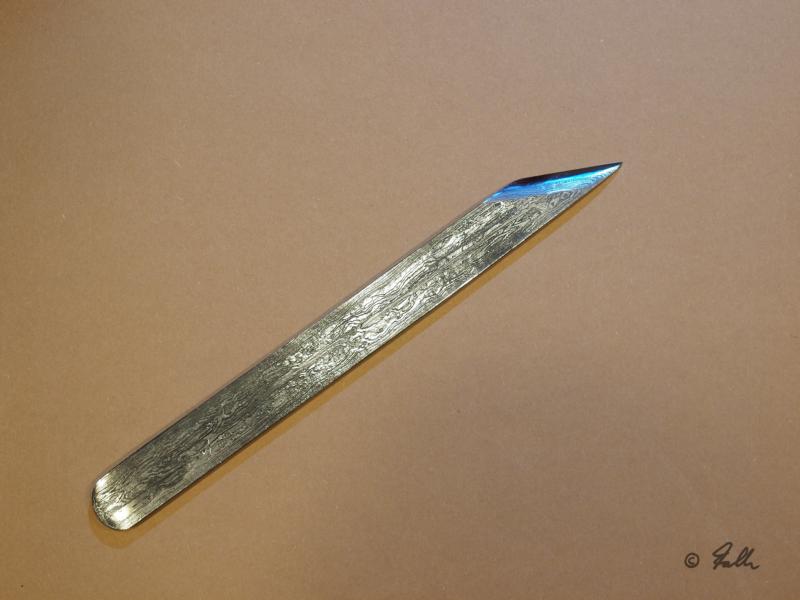 Zum Griffholz gibt es noch eine schöne Geschichte, ich war mit Niklas vor 2 Jahren auf der Arc Con Mannheim. Auf einem der Stände (Holz und Drechselzubehör) hab ich mir ein Paar Griffhölzer ausgesucht. Niklas kam mit dem Händler ins Gespräch und hat ihm über sein Messerprojekt erzählt. Plötzlich drückt ihm dieser ein Holzkantel in die Hand: “Schenk ich Dir, mach was schönes draus.“