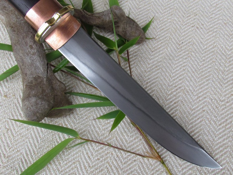 normalerweise plane, designe ich vorgängig meine Messer und suche/wähle anschließend das geeignet Material. Bei diesem Teil habe ich in meinen Materialkisten herumgewühlt und eine alte Feile, Messing, Neusilber, etwas Horn, der letzte Rest Ebenholz und Kupferblech auf dem Tisch gestapelt. Da mich die Konstruktion japanischer Messer interessiert ist nach etwas "googeln" und skizzieren folgendes Teil entstanden - das Messer ist ca. 25,5 cm lang, die Klinge ist 14,5 cm und differentiell mit Härtelinie gehärtet.