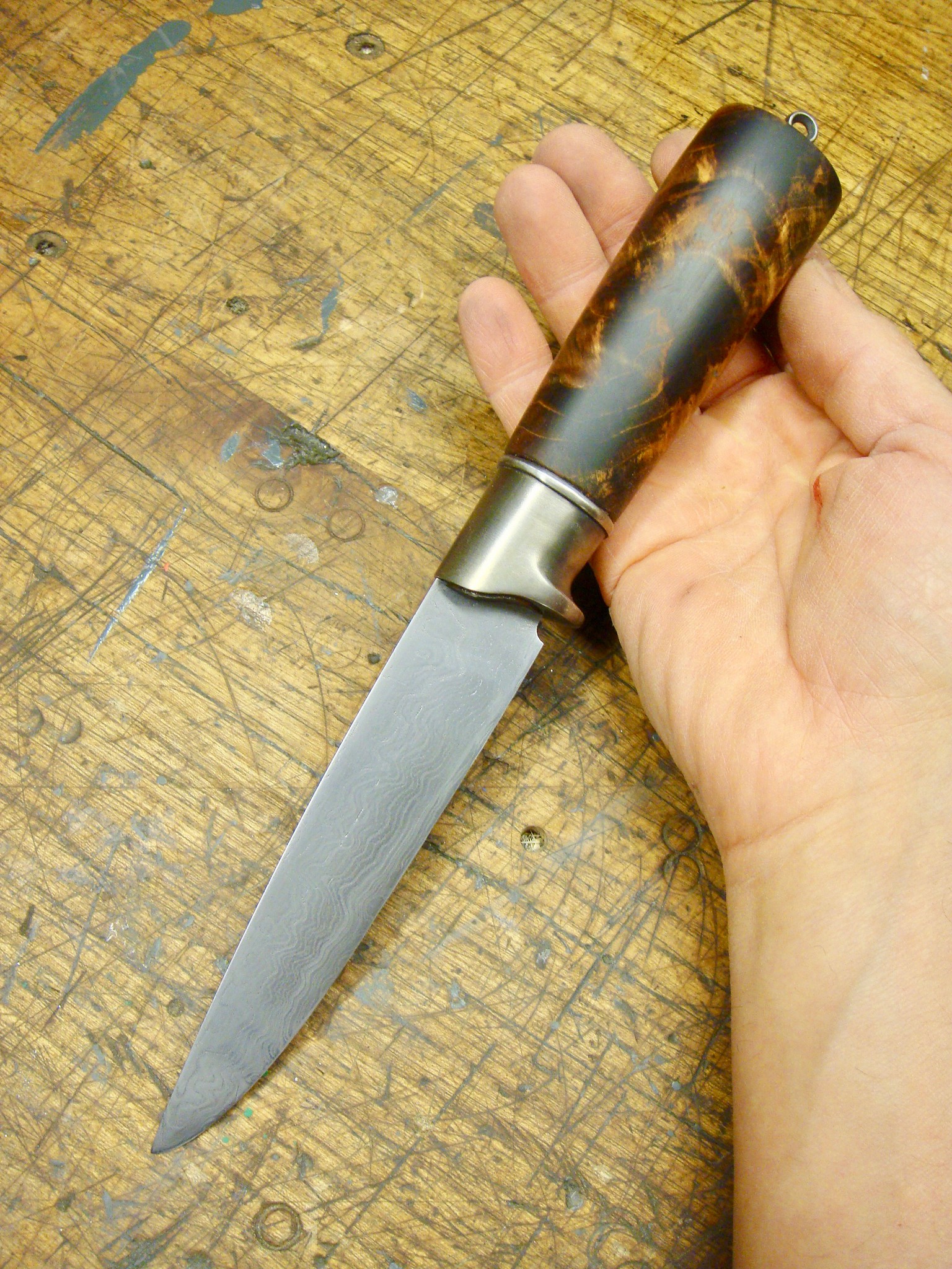 Der Damast-Rohling für die Klinge kam aus Schweden und ist, wie gesagt, von Haitha.