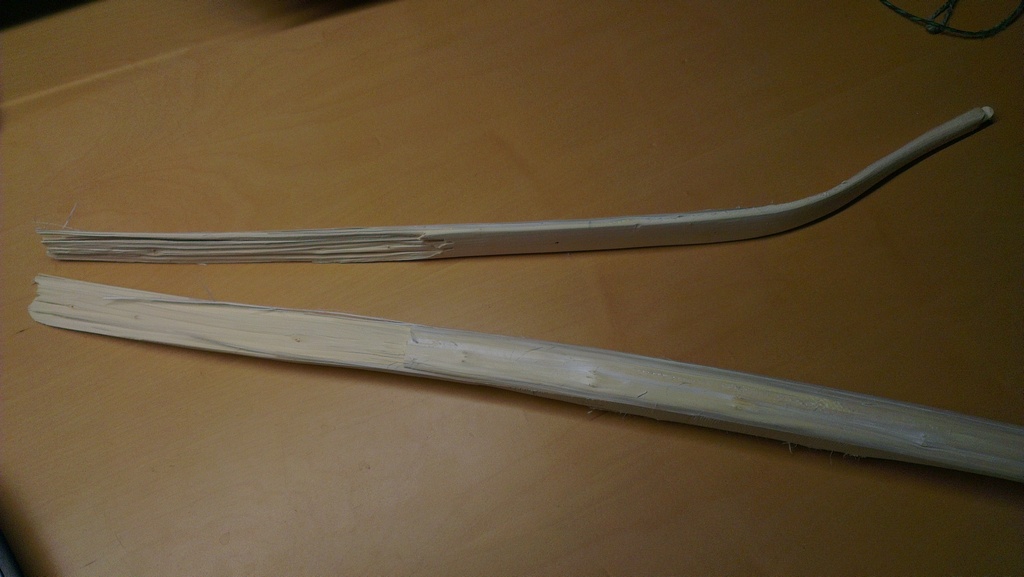 Damit die Recurves sich nicht wieder öffnen, habe ich eine Sehne revers aufgespannt.