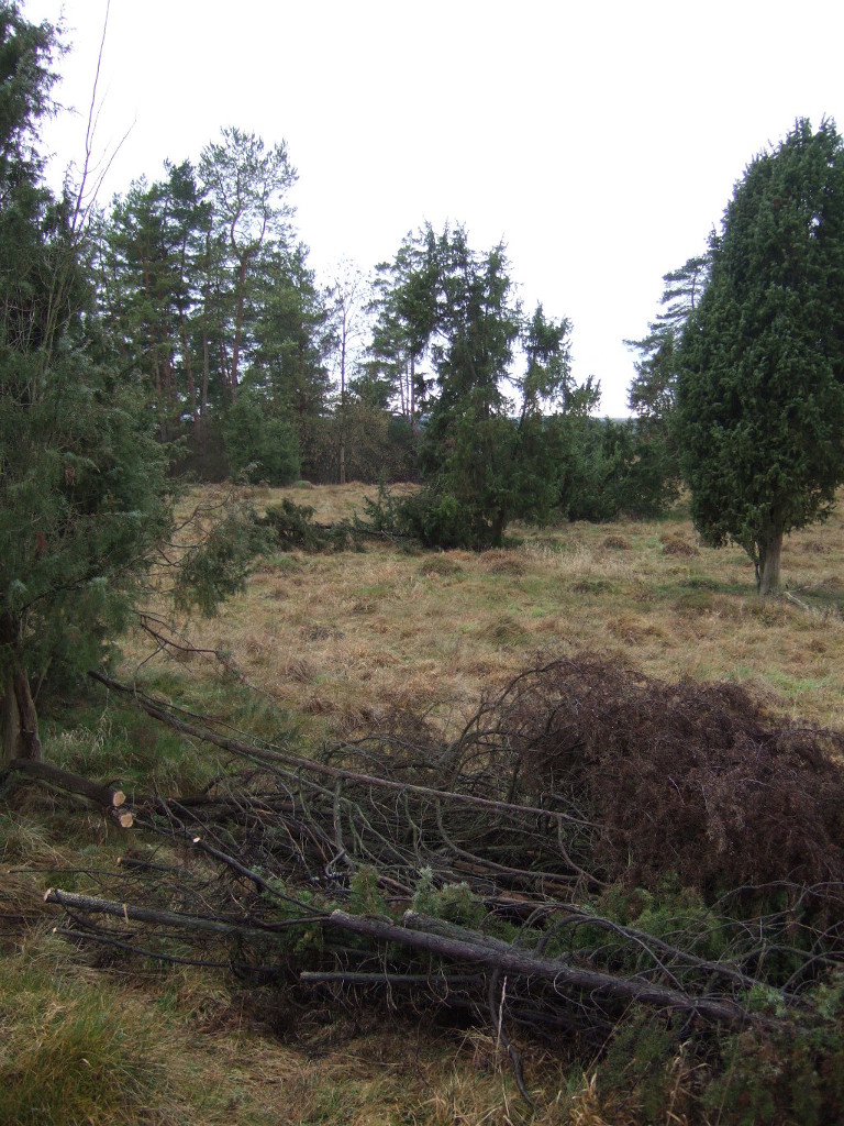 ich hatte heute Nachmittag ein Treffen mit unserem Revierförster an einer Magerwiese mit vielen Wacholderbüschen. Der Schnee oder der Wind hatte einige Stämmchen flach gelegt.