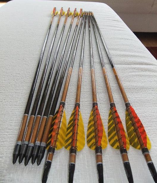 Den ersten satz meines lebens hatte ich fertig gekauft. Da durfte man fast sofort alle nocken und spitzen neu kleben. Dann kam auch zeitgleich der zweitbogen dazu. Dafür brauchs natürlich passende pfeile und so fing das an.