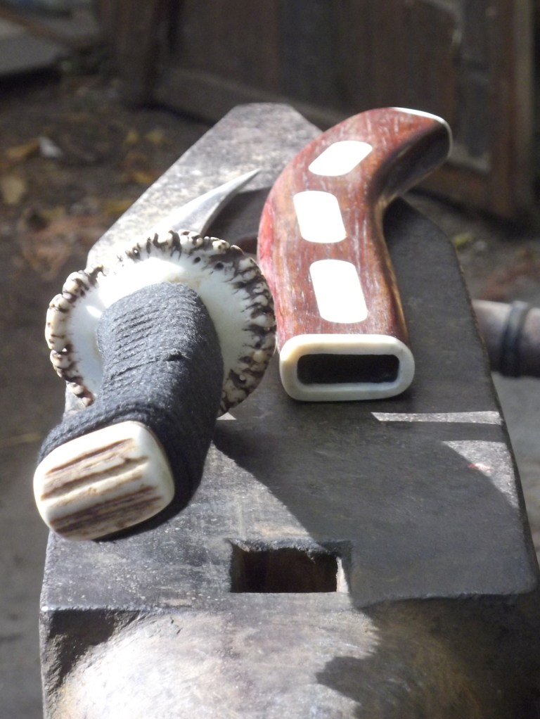 Der Griffschutz ist aus einer Hirschgeweihkrone, ebenso sind die Endkappen am Messergriff und an der Scheide aus Hirschgeweih; die Scheide selber ist aus Bongossi gemacht.