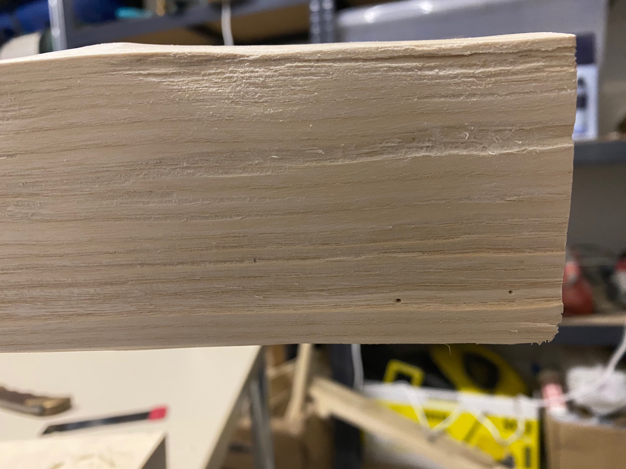 Ich wäre nun von der Mitte gegen das Ende vorgegangen und hätte Schicht um Schicht abgetragen; soweit ich das richtig sehe, macht das Holz an dieser Stelle einen Bogen nach oben (zum besseren Beurteilen müsste ich hier morgen wohl die Seite weiter schleifen)