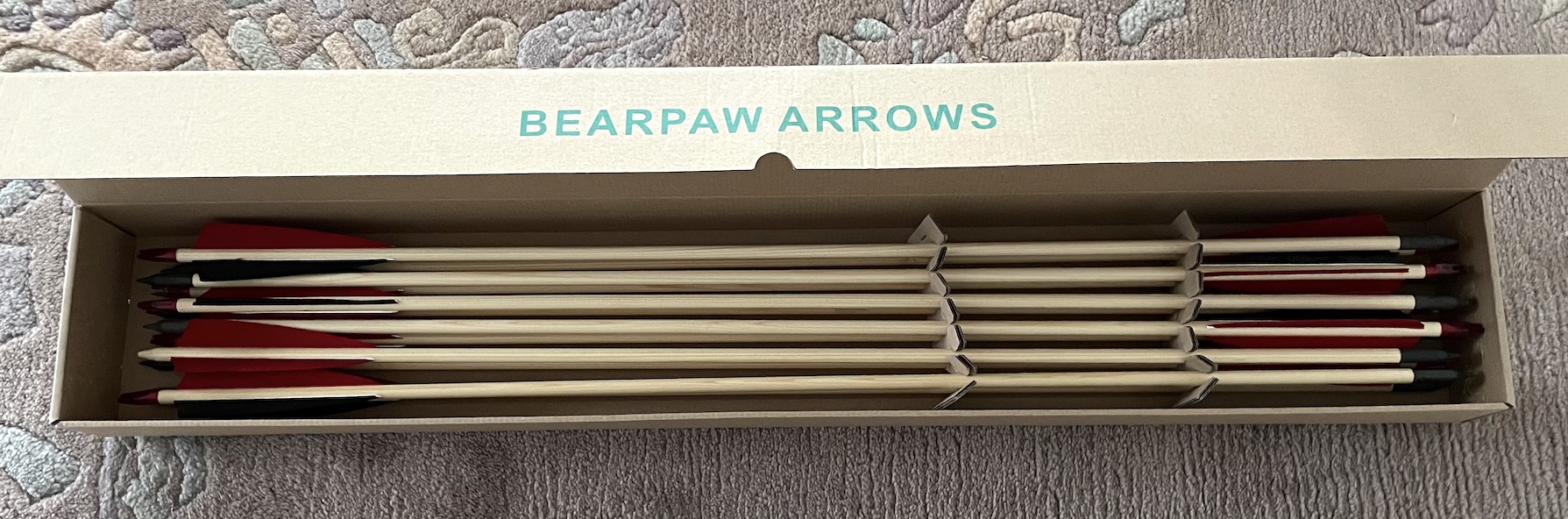 Als Preis stifte ich einen neuen Satz Bearpaw Pfeile (12 Stück, 11/32, 31 Zoll lang, 34 g schwer, Spine geschätzt 45-50?):