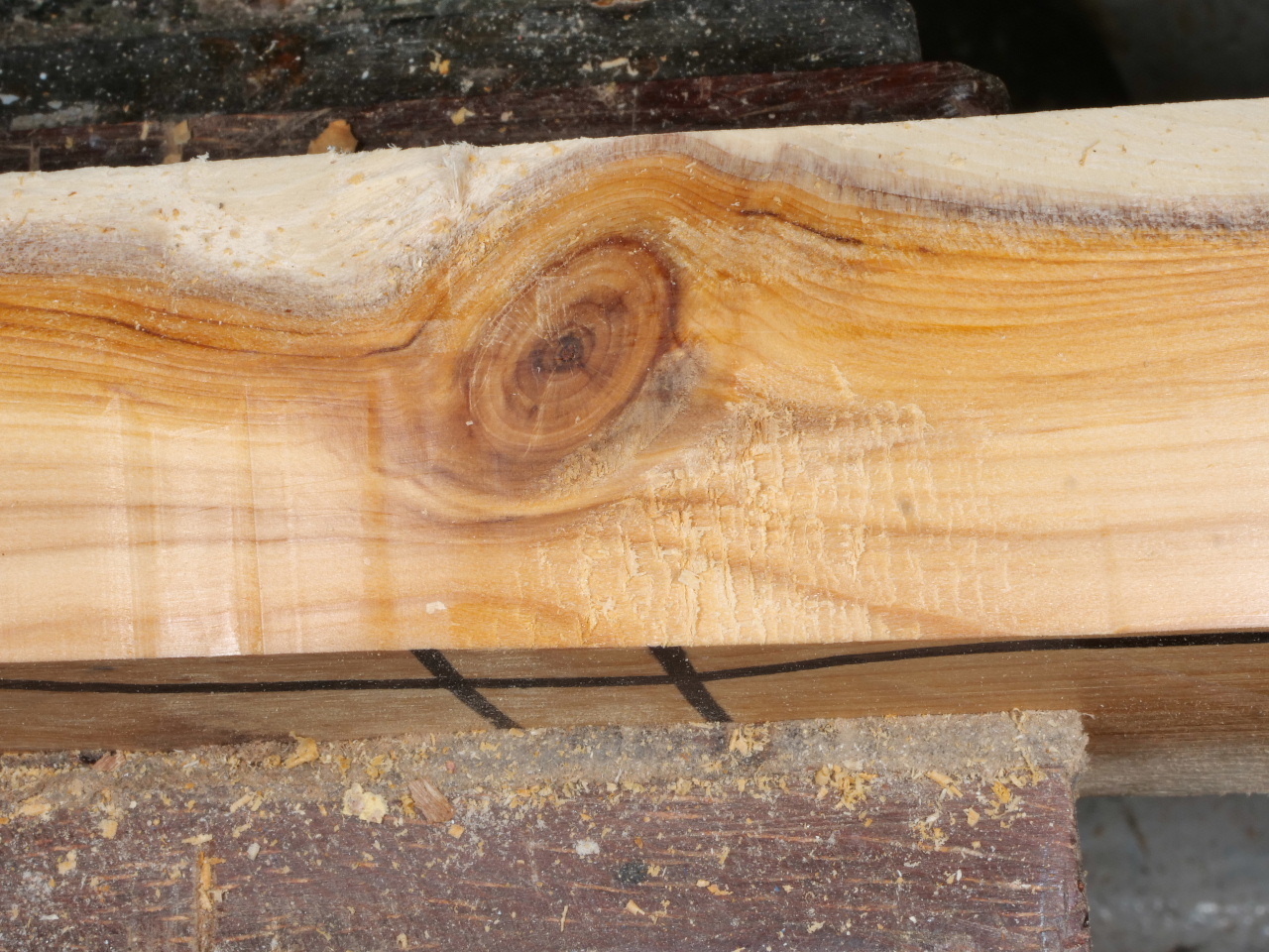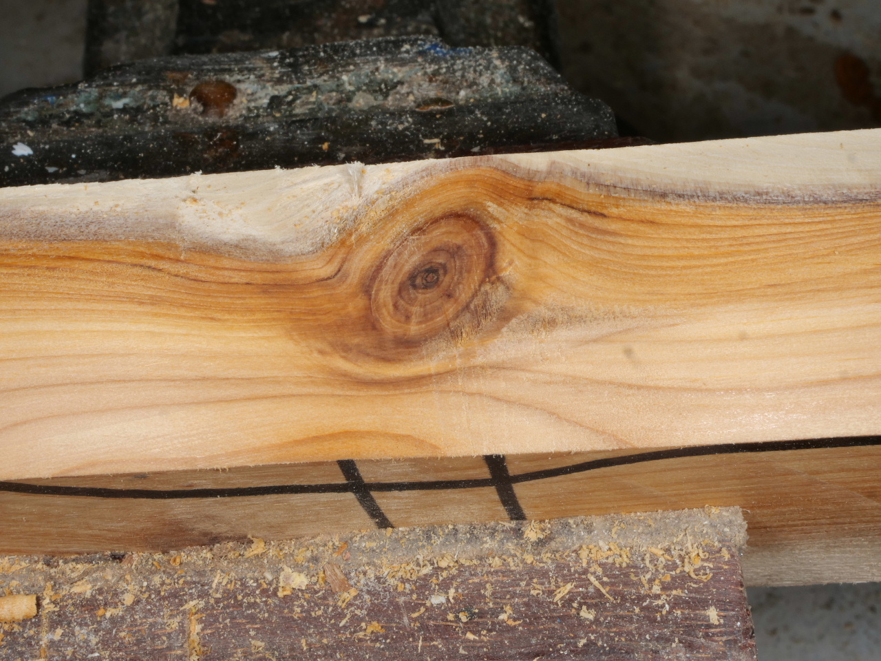 Die Bowyer's edge ist der einzige Hobel, der die Rubbelmarken der Vorgänger wieder glatt bekommt, auch am Ast. Voraussetzung ist, das man die Sohle kräftig aufs Holz drückt. Dann kommt auch der Span besser aus dem Schacht. Späne im Bild Mitte.