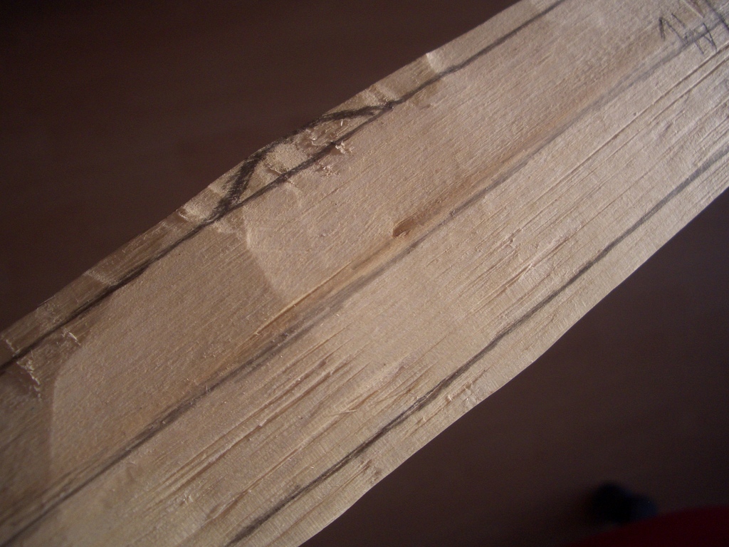 Heute hab ich den Tiefentaper angezeichnet. Ich lass den Griff noch etwas länger als angezeichnet, damit er später besser auf dem Tillerbaum liegt. Dadurch sind die Fades noch etwas steiler als beim fertigen Bogen.