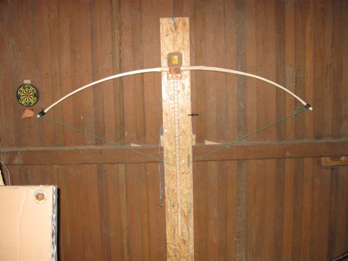 Ich habe noch bis ca. 25" getillert und dann mir eine Vorrichtung gebaut (eher geschnürt ;D ), um den Stab, der langsam zum Bogen wird auf Standhöhe zu bringen. (Um Chirions Luxusausführung nachzubauen war ich dann doch zu ungeduldig ;) )