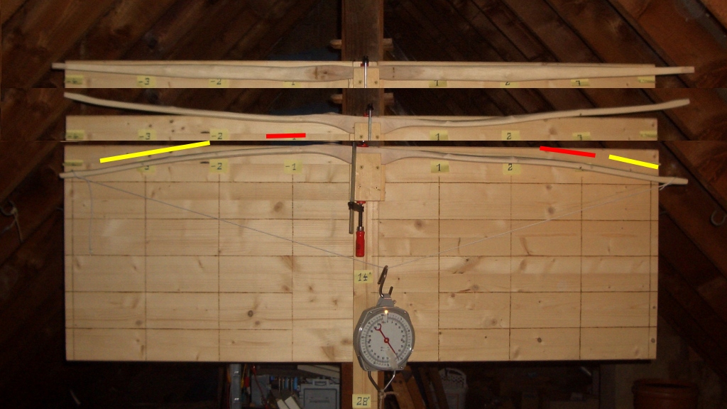 Danach hab ich, wie angekündigt den Breitentaper angepasst und ein wenig getillert. Ser linke Wurfarm ist zu stark. Ich finde der biegt sich aber insgesamt ganz schön. Die Enden sind noch etwas steif (nicht von den Tips irritieren lassen - das sind keine Recurves sondern stehengelassene Jahresringe) aber die kommen ja noch weiter rum, wenn ich die Sehne einkürze. Deswegen würde ich den linken Wurfarm jetzt gleichmäßig schwächen, bis sein Tip auf gleicher Höhe mit dem rechten ist. Ich würd mich über Kommentare zu dem Plan freuen.