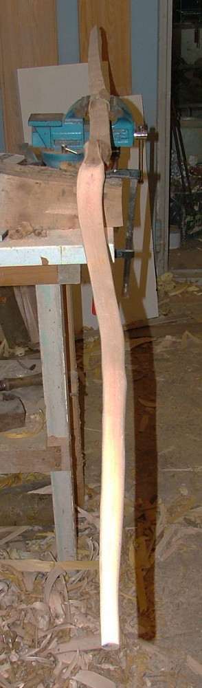 Ich hab den Bogen immer noch nicht auf Standhöhe. Vom Auszug her hab ich ihn eigentlich so weit, aber ich bin nicht stark genug, ihn aufzuspannen. Dafür sind immerhin auch gut 50# nötig. Bisher schaff ich es nur, dass die Sehne straff am Griff anliegt, aber freischwebend ist sie noch nicht. trotzdem sieht man, dass der Bogen trotz nicht vorhandener Standhöhe an den Enden noch zu steif ist.
