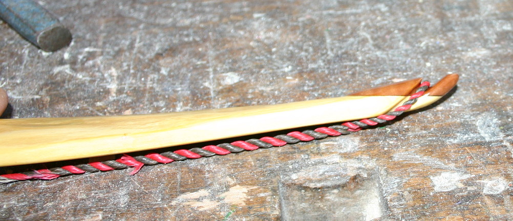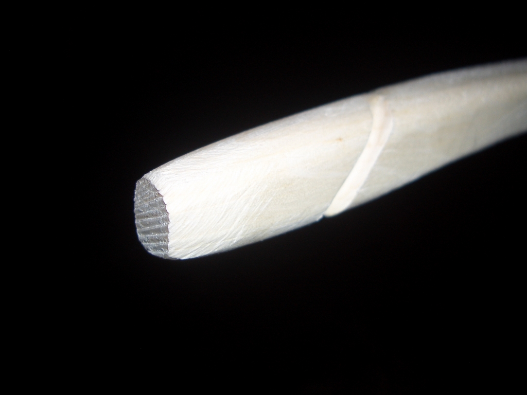 Der Markkanal wurde an den Bogenende ausgebohrt und ein Dübel aus Horn hinein geleimt, um die Nockkerbe zu verstärken.