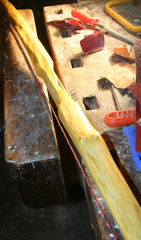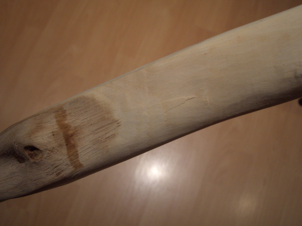 Ihr könnt mich gerne irgendwann quälen, wenn wir uns mal irgendwo treffen, aber ich werde die Verdrehung nicht weiter rausarbeiten und den Bogen damit schwächen. Ich bin so froh, daß aus dem störrischen Biest ein schießfähiger Bogen wird, der mir noch nicht um die Ohren geflogen ist UND der sogar mein erhofftes Zuggewicht hat