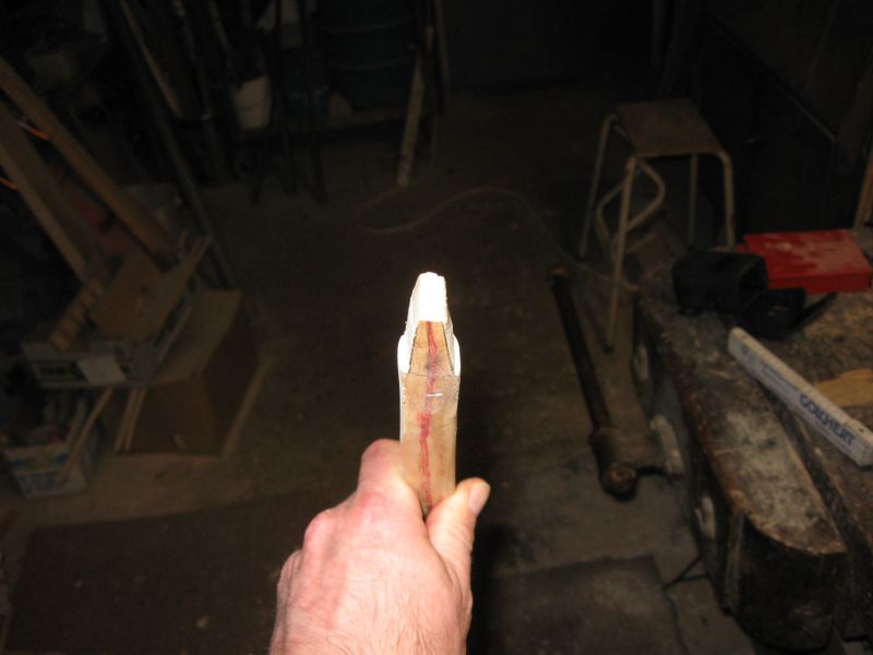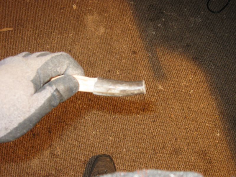 Dabei muss man sehr aufpassen, daß das Horn nicht am Schleifstein "hüpft", sonst arbeitet man sich eklige Ecken rein, die nur mit viel nachträglichem Schleifaufwand wieder zu entfernen sind. Zeitlich gesehen vergingen zwischen den beiden Arbeitsschritten ca. 2 min, bringt´s aber nur, wenn das Horn nicht an der Scheibe vor und zurück springt.