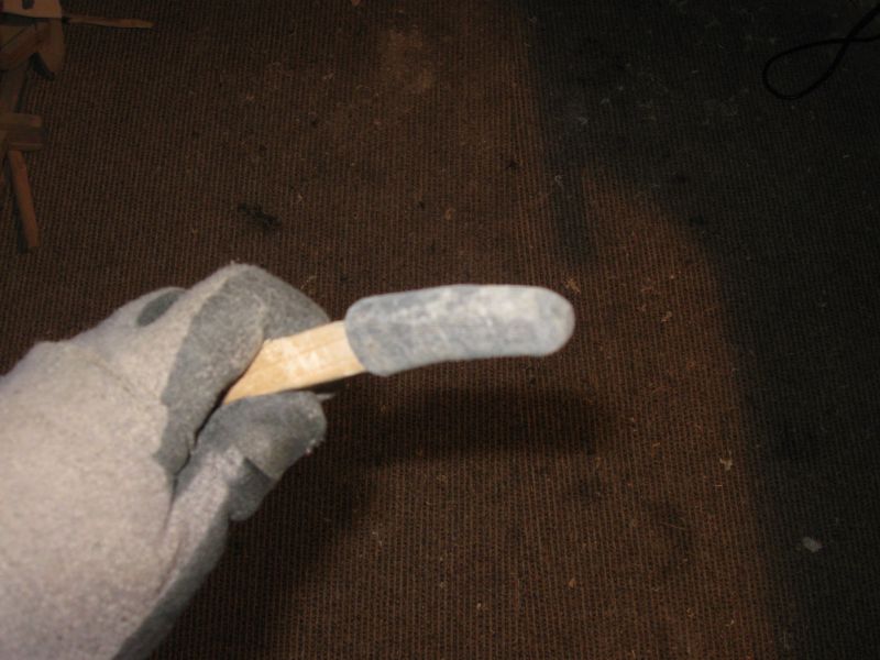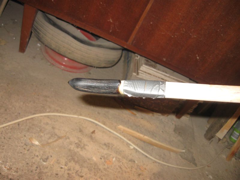 Zwischendurch habe ich die Holztips des Bogens angepasst: Form angezeichnet und auf ein 25cm langes Hölzchen aufgesteckt und geklemmt zur weiteren Bearbeitung Auf dem Bogen: Ich muß doch noch einen Namen finden.............