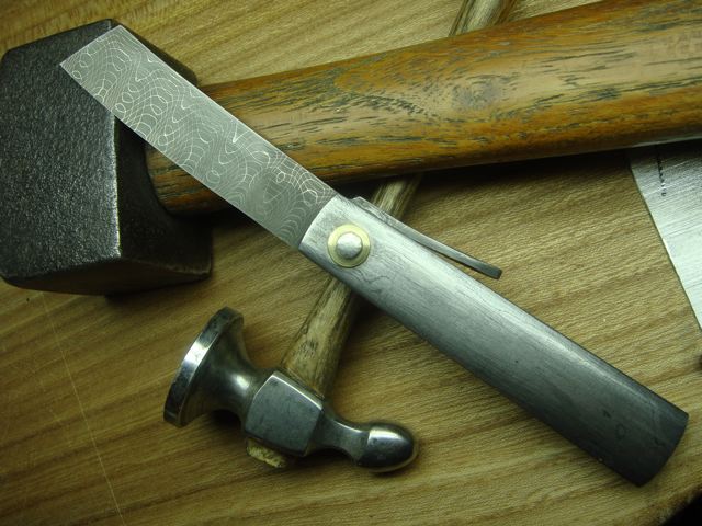 Nun kann man die Backen endgültig an der Klinge anbringen. Ich hab sie zusätzlich zu den Nieten noch geklebt mit Uhu Endfest. Die Nieten sollte man soweit kürzen, dass sie etwa einen oder zwei mm über die Backen rausschauen. Auf die Nietenden wird sachte mit einem Hammer geklopft, so dass diese leicht gestaucht werden und sich richtig in den Backen verkeilen. Das ganze überschleifen, fertig.