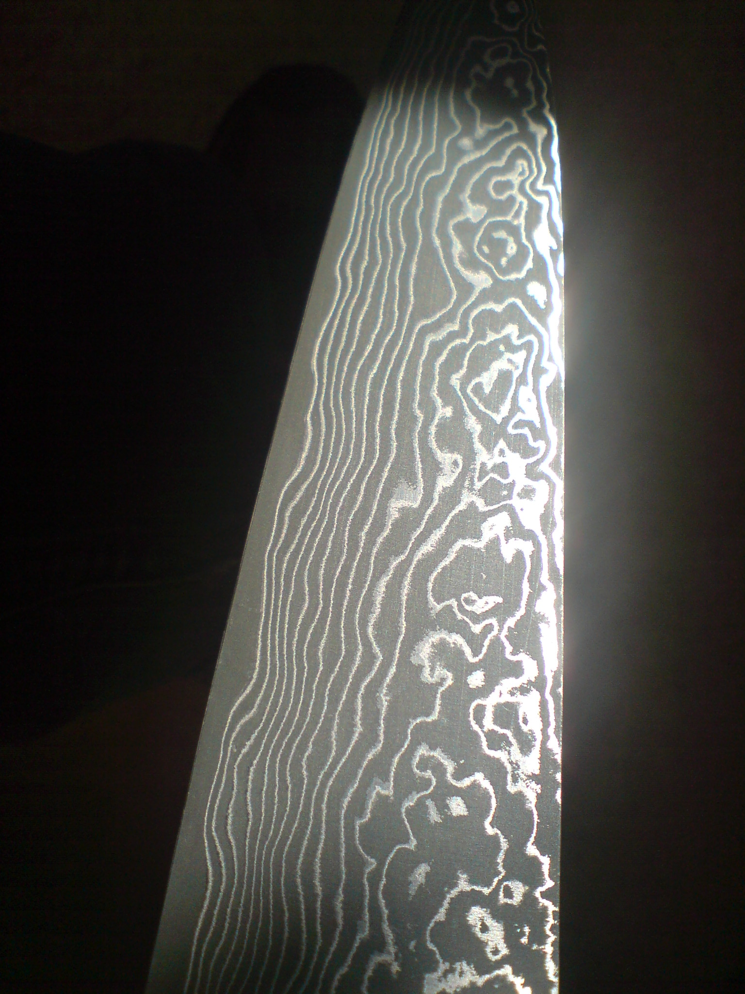 Naja das Messer hat jetzt einen gleichmäßigen "Schliff-Look" und bleibt unpoliert, denn der Griff ist bereits dran befestigt und das Messer im Grunde fertig, ausser Schneide. Das Gefüge ist durchaus nicht grob. Es ist zur Zeit nahezu rasierscharf und wenn man mit dem Fingernagel über die Schneide fährt, fühlt man nichts. Zumindest in dem Maßstab ist die Schneide fein, scharf und glatt. Für ein Messer das ich zum Grillen, Fleisch und sonstiges Schneiden und Essen benutze ist das auch absolut ausreichend. :)