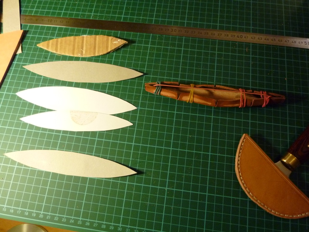 Gestern Abend war ich dann auf der Suche nach der passenden Form für den Boden: Wie lang, wie breit? Da ich den Köcher ggü dem Original um 1,5cm verbreitert habe, wurde auch eine längere Ellipse fällig. Da half nur ausprobieren.