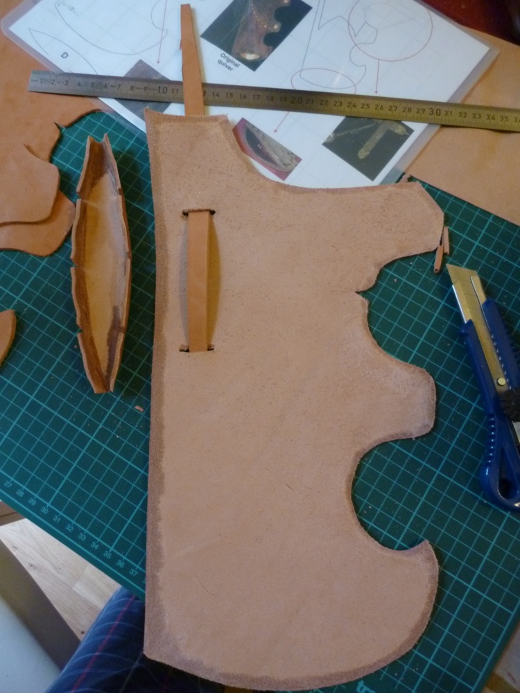 Links im Bild das schiffchenförmige Ergebnis: der Boden. Rechts der am Körper anliegende Teil des Köchers mit den Schlitzen für die Halterung.