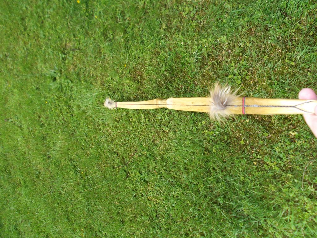 Das ist der etwas krumme obere Wurfarm. Bis jetzt sind ca 70 Pfeile geflogen, und ich hab ich bißschen Sorge dass er sch da weg dreht zu sehen ist davon noch nichts. Ausser dass die Sehne halt nicht mittig über den Arm läuft. Die rechte Sehnenkerbe hab ich etwas tiefer gemacht als die linke. Aber einen Effekt hab ich noch nicht festgestellt.