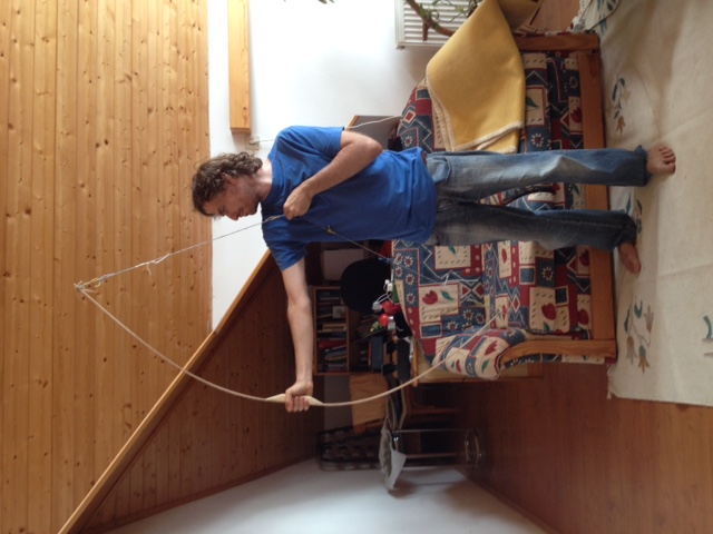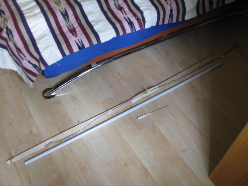 Außerdem zeigt mahagugu in seinem letzen Beitrag vor meinem hier einen Bogen. Was will man mehr? Er macht alles anders: Der Bogen ist aus irgendeinem komischen Holz, mit dem Cutter zurechtgeschnitzt und hat 1#@x". Für den Größenvergleich kann man sich an einer Art Minipfeil, einer Plastikstange (soweit ich das erkenne) und an einer Doppelbetthälfte orientieren, oder auch nicht. Den Tiller werden wir anhand des Fotos nicht beurteilen können, aber es handelt sich eindeutig um einen Bogen - anders halt.