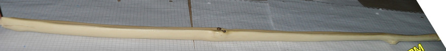 Der Bruch ist aussen gerade und glatt unmittelbar drüber ist einer der unvermeidlichen Hollerknoten die im Holz gegenständig (180°) sind und sich im 90° Winkel abwechseln. Ich habe die Knubbellinie mittig reingelegt und hatte eigentlich befürchtet, dass die beiden Totastlöcher am Rand des gebrochenen Wurfarms die neuralgischen sind. Dieser mittige hat erstmal nur bewirkt dass dieser WA griffnah nicht gebogen hat, das habe ich dann durch Tillern geändert so dass er sich dort schliesslich auch leicht gebogen hat. Man sieht im Bruchbereich auch einen Riss in Richtung parallel zum Wurfarm der direkt am Knoten seitlich vorbeigeht.
