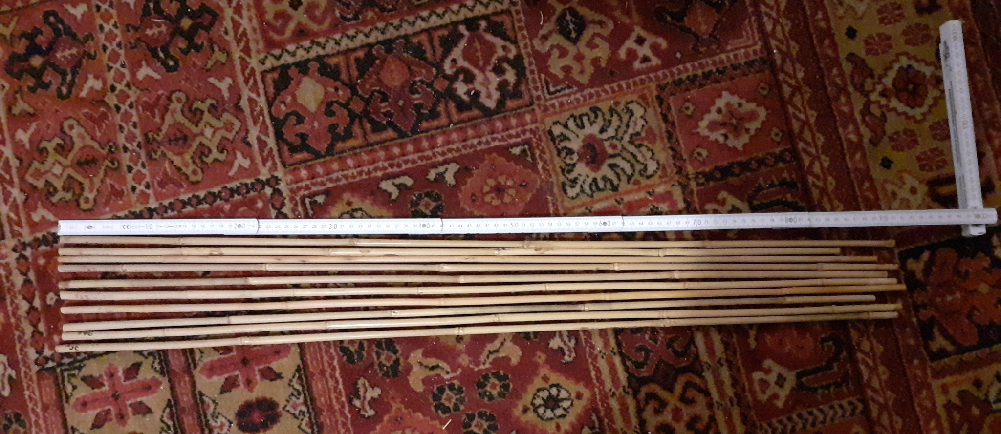 Ein 10er-Pack vorgerichtete Bambuspfeilrohlinge von 28-36g Gewicht, Länge von 85-92cm.Zum Teil schon mit epoxiertem Bambusschaschlikspieß an den Enden gepfröpfelt. :D