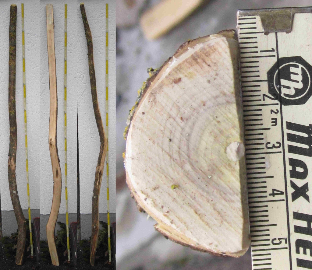 Endlich hab ich ein paar Bilder von meinen Fliederstaves gemacht, die ich in der ersten Januarwoche geerntet hatte. Die ersten beiden Staves sind so um die 2 m lang, die anderen beiden 160+ cm. Alles andere sieht man in den Bildern, immer von links nach rechts: Rücken - Bauch - Seite - Stirnfläche. Bei den Stirnflächen hab ich immer die dünnere Seite abgelichtet, wobei die kürzeren Staves eigentlich durchgehend gleich dick sind. Da hab ich wohl sogar die untere Seite fotografiert, denn man sieht deutlich die zwei Kerne/Markkanäle, sprich, die sind jeweils aus zwei Ästen zusammengewachsen. An der oberen Stirnfläche haben sie nur noch einen Kern.