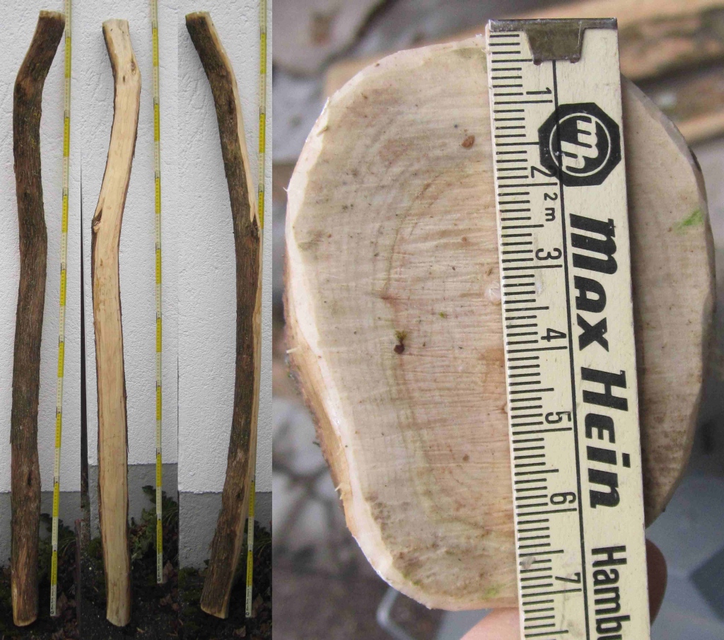 Endlich hab ich ein paar Bilder von meinen Fliederstaves gemacht, die ich in der ersten Januarwoche geerntet hatte. Die ersten beiden Staves sind so um die 2 m lang, die anderen beiden 160+ cm. Alles andere sieht man in den Bildern, immer von links nach rechts: Rücken - Bauch - Seite - Stirnfläche. Bei den Stirnflächen hab ich immer die dünnere Seite abgelichtet, wobei die kürzeren Staves eigentlich durchgehend gleich dick sind. Da hab ich wohl sogar die untere Seite fotografiert, denn man sieht deutlich die zwei Kerne/Markkanäle, sprich, die sind jeweils aus zwei Ästen zusammengewachsen. An der oberen Stirnfläche haben sie nur noch einen Kern.