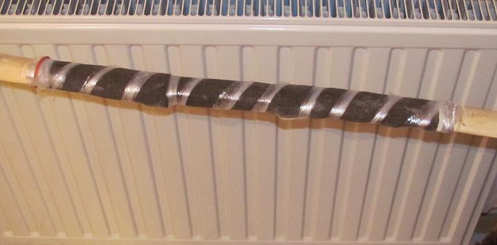 Soderle! Ich habe auf den Griff und jeweils ein Stück oben drüber und untendrunter ein Teilbacking aufgepappt. Dicke, dickes Zeltleinen mit Ponal getränkt. Zum Trocknen mit Haushaltsgummis und Frischhaltefolie fixiert. Das hat die Schwachstelle überm Griff aber nur wenig gebessert.