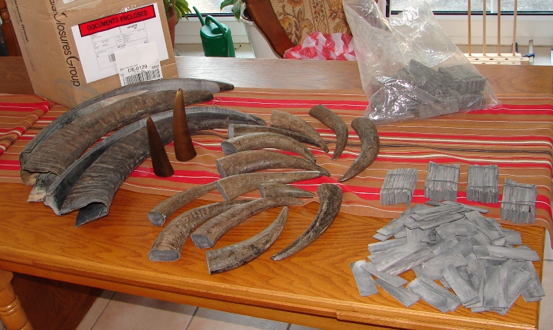 Hier noch einmal die andere Bestellung, 2 kg Hornplätchen, eines noch in der Tüte, 2 kg Hornspitzen, 2 Hornspitzen die eine Grüne Farbe aufweisen stehend, dünner und geschliffen haben sie so einen Jadeton und 2 Büffelhornstreifen, ich bin mir nicht mehr sicher 65-70cm oder 70-75cm, Axel helf mir mal!