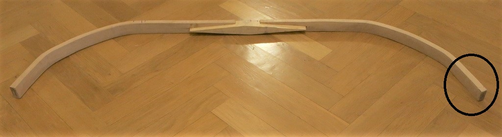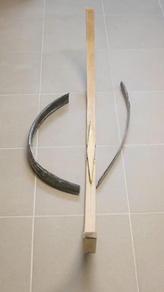 Der Bogen ist FAST so gerade wie vorher, die Rillen musste ich nur nachziehen. An den Tips ist er jetzt ca. 5 mm aus der Ebene, aber das lässt sich später mit Wärme korrigieren (stimmt's?). Wenn die Hörner drauf sind ist er vielleicht erst wieder anders schief...